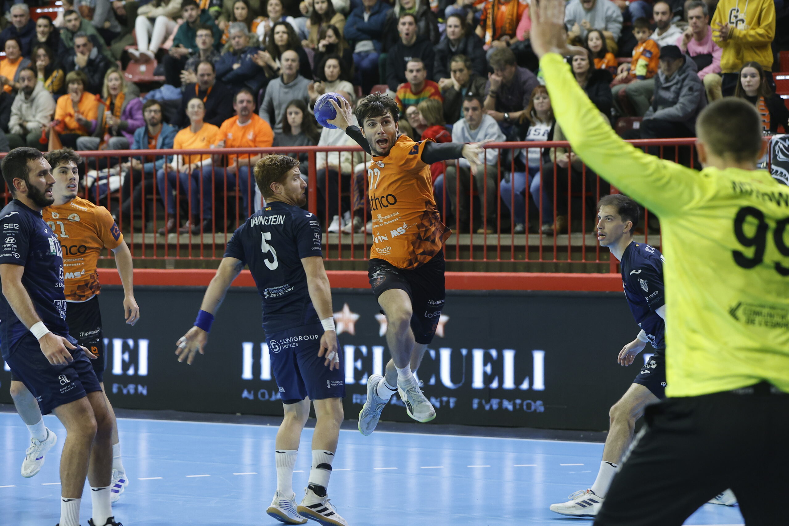El argentino, en su excitación liberó de un problema a los naranjas. Un impacto violento de Moscariello en el rostro de Prokop acabó con el 11 expulsado. Tras una pausa para atender al eslovaco, el juego devino en un penalti que no perdonó Ángel. La tensión entre ambos equipos crecía exponencialmente, al igual que hizo el ruido tras un paradón de Calle a penalti de Valles. El Bathco BM Torrelavega masticó la superioridad hasta encontrar el golazo de Cangiani para el 19 – 19.